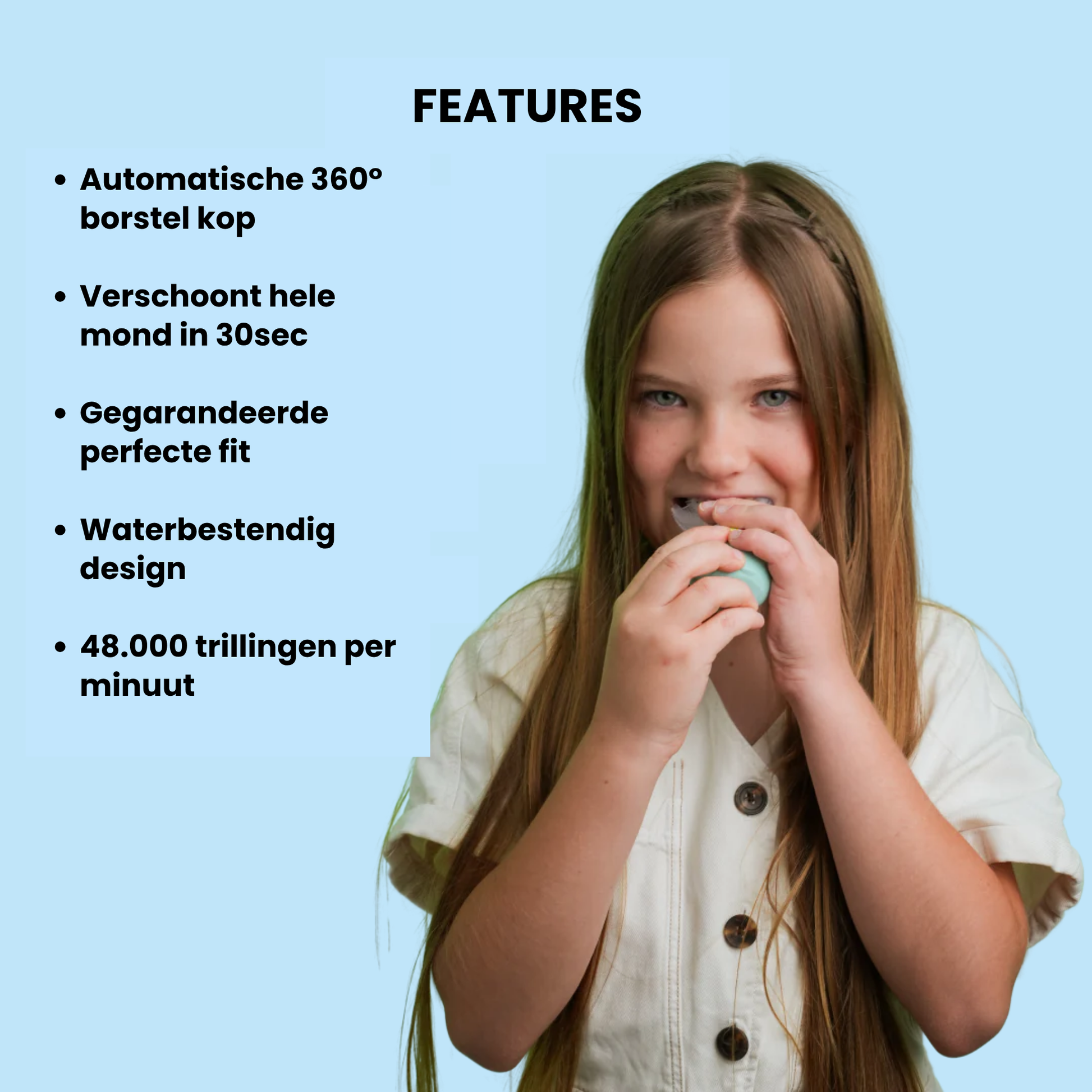 De U-BRUSH Kids is speciaal ontworpen voor kindergebitjes en maakt tandenpoetsen eenvoudig, effectief én leuk. Dankzij het U-vormige ontwerp en zachte, hypoallergene siliconen sluit de borstel perfect aan op het gebit van je kind, en reinigt hij alle tanden tegelijkertijd in slechts 45 seconden.
